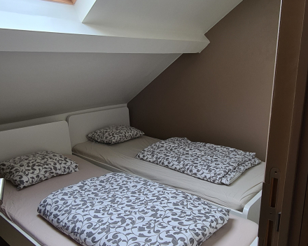 1 kleinere slaapkamer met 2 eenpersoonsbedden met nachttafel en verduisterende veluxgordijnen (alle lakens zijn ook inbegrepen)